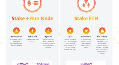 RocketPool與Lido的區別在于它選擇驗證者的過程。RocketPool協議是無須許可的,而不是將決定權交給其Token持有者。任何人都可以通過創建一個「迷你池」(minipool)成為該網絡中的節點運營者:為此,節點運營者需要存入16ETH(即以太坊協議規定的32ETH要求的一半),其余的16ETH來自用戶存款。此外,「迷你池」運營者還需要至少質押價值1.6ETH(也即其質押的16ETH的10%)的RPLToken,這是用于在驗證者節點發生大型罰沒事故時作為該協議的一個安全保障。RPL是RocketPool協議的治理Token,也可以用于質押進RocketPool節點上作為一種保險形式。具體來說就是,這些由「迷你池」運營者質押的RPLToken將作為抵押品,當節點運營者在履行驗證職責過程中被以太坊協議嚴重懲罰或者遭遇罰沒,并導致該節點的質押金少于16ETH時,這些RPL抵押品將通過拍賣的形式被賣出以獲得ETH,從而幫助補償RocketPool協議這些損失的ETH。作為提供這種安全保障的回報,該協議將通過協議內置的Token通脹(增發)來向節點運營者提供RPLToken獎勵。RocketPool中的節點運營者質押的RPLToken越多(上限是其質押的ETH價值的150%),那么就能獲得越多的RPLToken獎勵。RocketPool在協調節點運營商的環節區別最大。本身不選擇節點運營商,而是采用無許可的眾包模式,這也是RocketPool主打的去中心化賣點,但是用戶的資產依舊托管在RocketPool。RocketPool節點運營商門檻被降低至16ETH。RocketPool正在迅速發展成為加密領域領先的流動性質押服務提供商之一。去中心化質押并使其更容易為大眾所接受。RocketPool的燃料功能之一是其無需許可的驗證,它允許任何節點運營商參與網絡驗證。要解鎖此功能,驗證者需要提供16ETH抵押品和價值至少1.6ETH的RPL債券。這創建了一個內置的削減保護機制,使用戶的投資免受質押的危害。