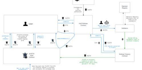 FraxEther系統包括三個主要組件,FraxEther(frxETH),stakedFraxEther(sfrxETH)和FraxETHMinter:frxETH作為一種利用Frax在穩定幣上的成功的方法與ETH松散掛鉤的穩定幣,并將ETH引入Frax生態系統。sfrxETH是可以積累收益的frxETH。從Frax以太驗證節點產生的所有利潤都分配給sfrxETH持有者。通過將frxETH交換為sfrxETH,用戶就有資格獲得質押收益,在將sfrxETH轉換回frxETH時贖回。FraxETHMinter(frxETHMinter)允許ETH交換frxETH,將ETH帶入Frax生態系統,在條件允許的情況下創建新的驗證節點,并鑄造與發送的ETH數量相等的新的frxETH。