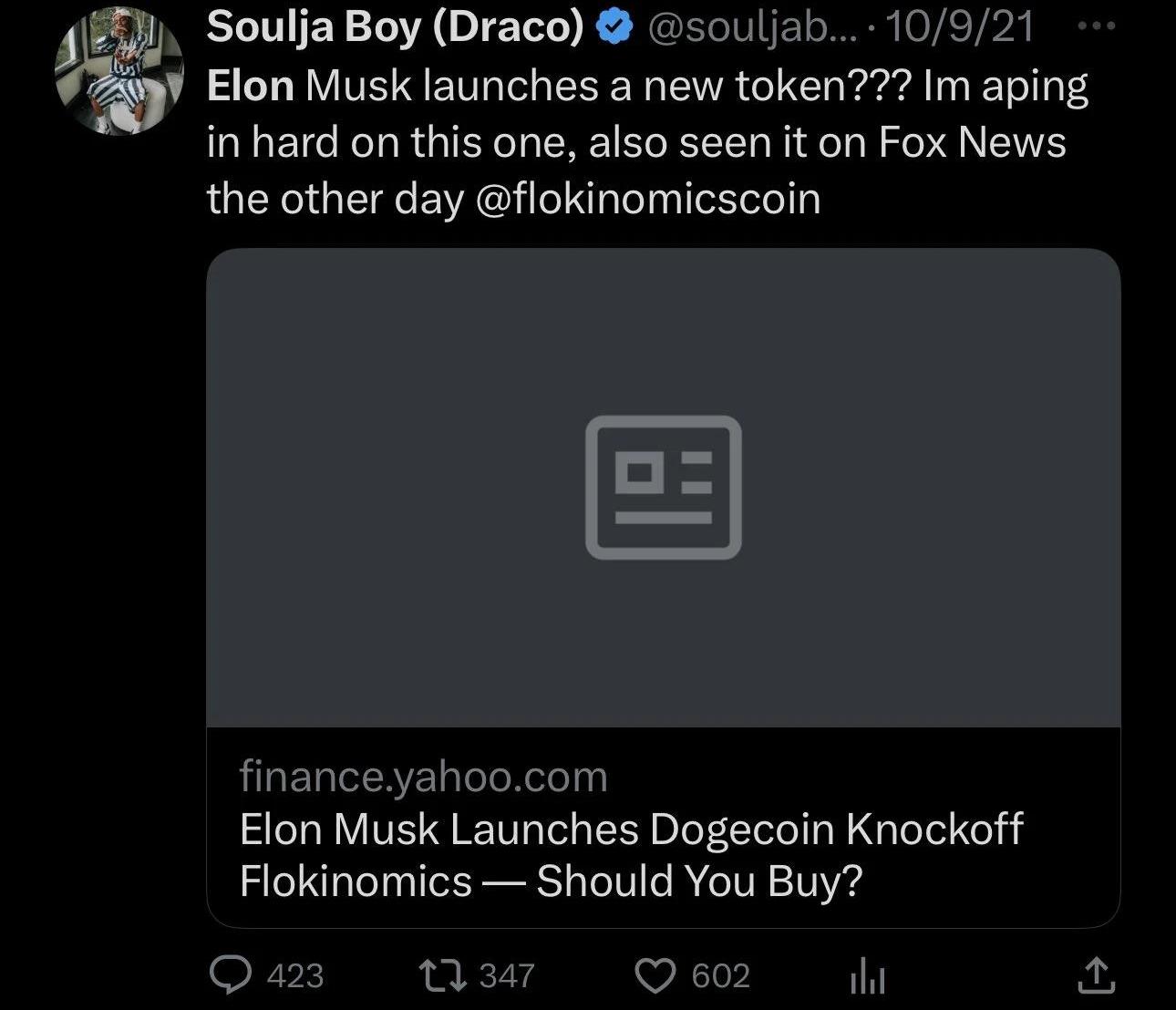 2021年10月9日,SouljaBoy在推特上發布了一個騙局項目Flokinomics,Flokinomics付費買通媒體,聲稱該項目是埃隆·馬斯克推出的。最終該項目的官推和網站均被刪除。