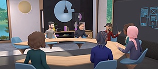 使用 Oculus Quest 2 設備登錄,在家工作的人們可以通過虛擬方式參加會議,并且享受身處同一個房間的感覺。在此平臺中可以最多 16 人可以一起在一個工作室中,而另外 34 人可以在不戴AR/VR設備的情況下通過視頻通話加入。而會議室的面板則可以實時連接我們的計算機屏幕進行展示。