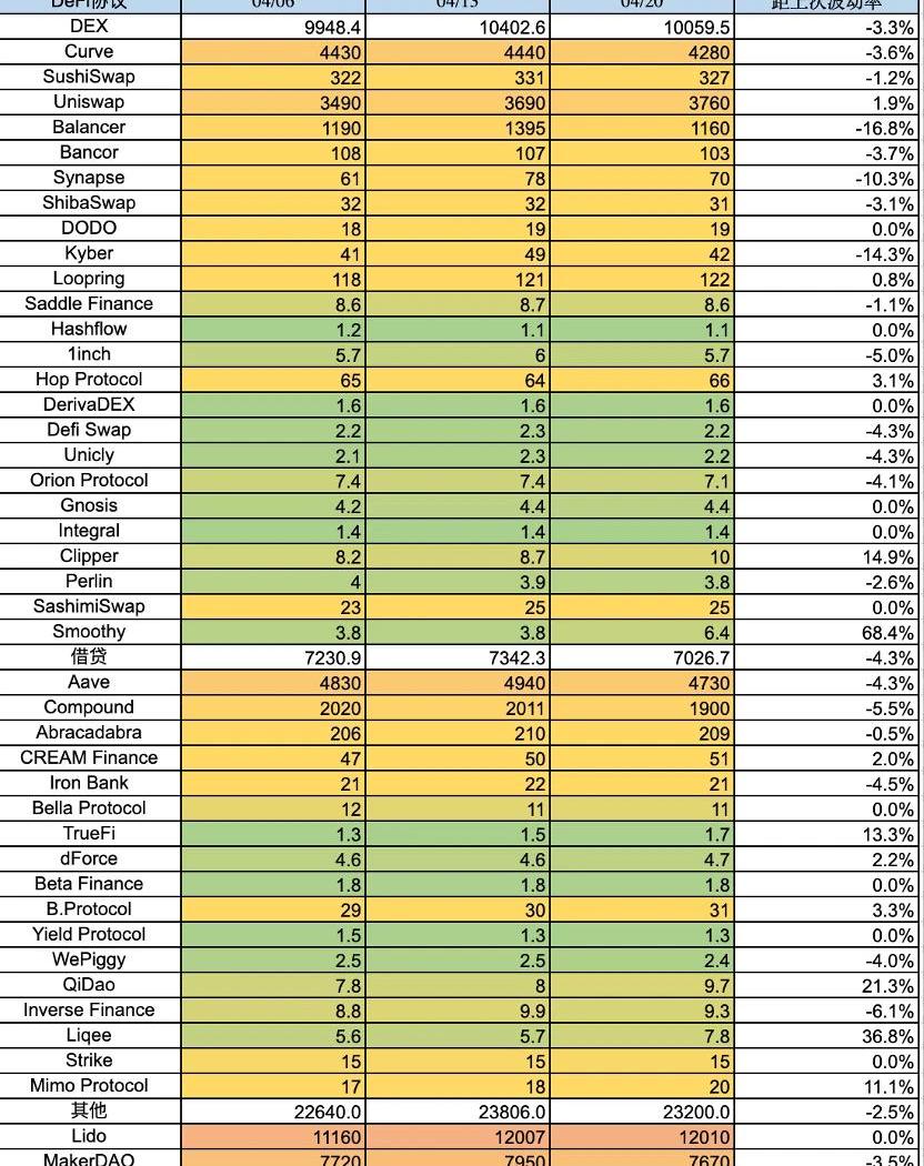 本周TVL出現4.18B的下跌,下降幅度為7.61%,雖然本周meme集體爆發,但市場在回調鞏固。ETH鏈占比同樣下降,從上周的61.3%下降到59.33%,降幅~2%,回到了上個月的水平,但近幾個月的大趨勢看eth生態的TVL在穩定上升。從近七日的數據看,Optimism的TVL在連續幾周后略微反彈,本周漲幅為2.89%,其他Layer2的公鏈都在下跌。Arbitrum下跌0.26%,Polygon下跌1.26%,、Avalanche下跌1.33%。三、各鏈協議鎖倉量情況