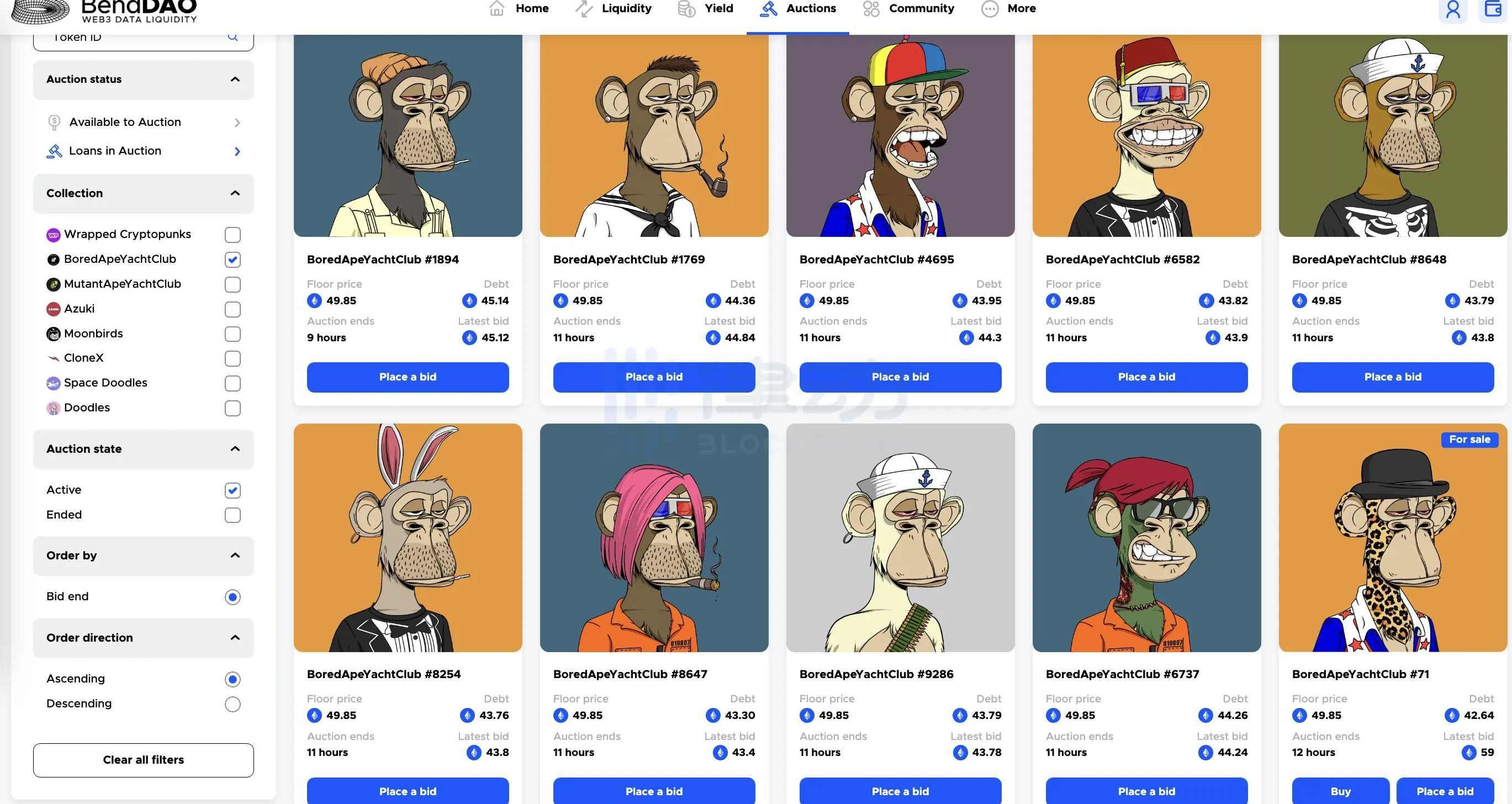 2022年11月15日,Franklin在blur上接受了4個低于地板價的bid,并在地板價大量掛單。巨鯨的「清倉甩賣」讓市場極度恐慌,人們對BAYC的信念開始動搖。不斷有人開始卷地板,想要在BAYC覆滅前出逃。當預言機將不斷下跌的地板價喂價給BendDAO平臺,大量處于拍賣邊緣的BAYC開始觸發清算。獲利機會就此來臨!Franklin將自己的14個BAYC放到了BendDAO進行抵押貸款,并用貸款資金和之前售賣BAYC獲得的ETH,對BendDAO上7個正拍賣清算的BAYC進行了競標。作為首個競標人,如果借方還清債務,就能獲得借方債務總額5%的獎勵金。相關閱讀:《BAYC大崩盤:一夫當關,萬夫清算》