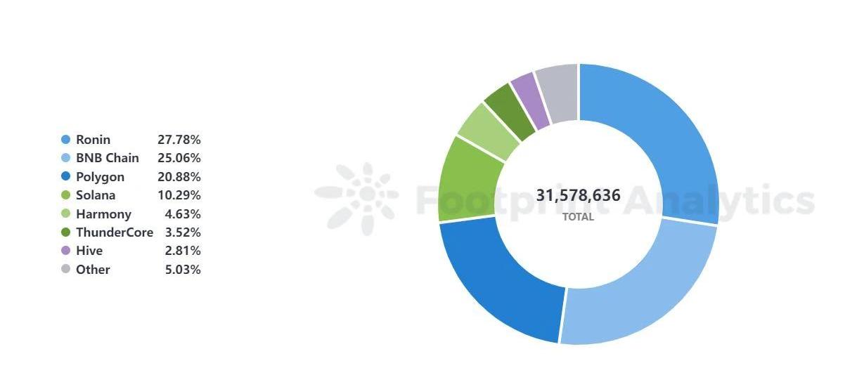 PercentageoftheTotalUsersbyChain開發者應該考慮的數據指標之一是區塊鏈上的用戶數量。這可以表明特定區塊鏈的受歡迎程度,以及游戲的潛在市場規模。根據FootprintAnalytics數據,截至2023年4月,BNBChain擁有超過900萬用戶,占GameFi市場總量的25%,使其成為最廣泛使用的GameFi鏈之一。