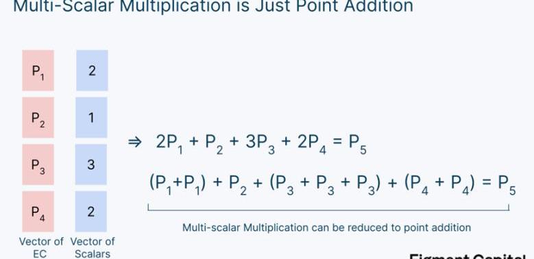 這種將多個橢圓曲線點,與標量相乘,然后相加,得到橢圓曲線上的一個新點的操作稱為多標量乘法。MSM是ZKP生成中最重要的操作之一,然而它只是一個點積。實際上比這還要簡單:MSM可以被改寫為一堆EC點的加法。