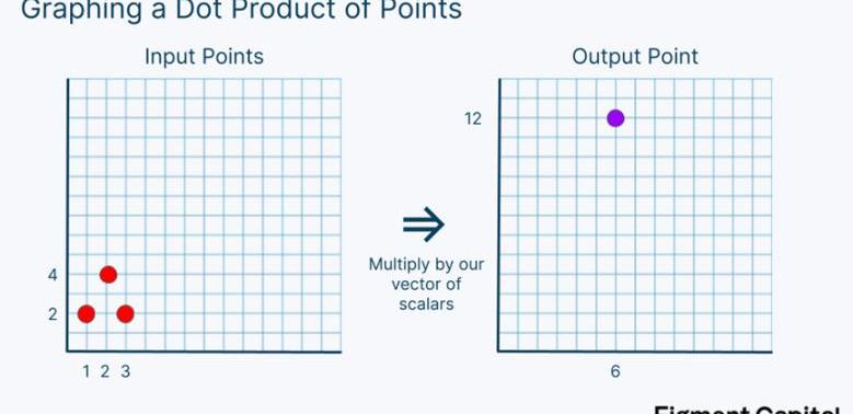 一個向量就是一個數字列表。注意,我們把兩個向量的數字作為輸入,并產生一個單一的數字作為輸出。現在,讓我們修改一下我們的例子。我們可以不計算2個數字向量的點積,而是計算一個點的向量和一個數字向量的點積。