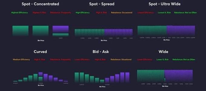 用戶將能夠選擇他們喜歡的價格范圍和流動性形態,以及他們想要存入流動性的“Bin”數量。從這些設置中,用戶可以制定多達6種基本策略,每種策略都有不同的優點和缺點。