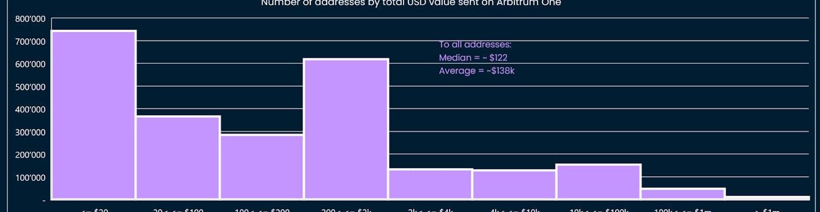 在2023年2月6日之前橋接到ArbitrumOne的約230萬個錢包中,有625,143個或約28%獲得了超過3個以上的積分,并有資格獲得新發行的Arbitrum代幣。這個資格號碼是ex-sybilex-functional-entity。大約3.7萬個地址與功能類的錢包相關聯,例如橋接智能合約、中心化交易所錢包或銷毀地址,這些會被排除。大約13.5萬個地址被確定為女巫地址,也被排除在外。我們可視化了每個地址的代幣分配,符合條件的地址總數中只有約8.6%獲得了4,000個以上的代幣: