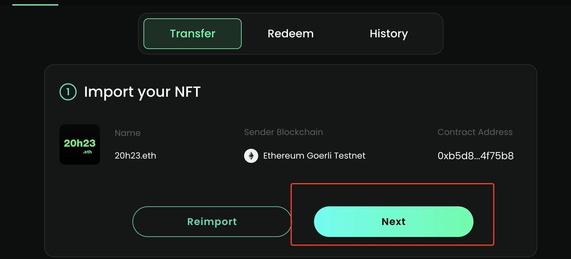 選擇你要將NFT轉移到哪個測試網絡,我這里選的ArbitrumGoerli測試網,前提是你需要把ETHGoerli測試代幣跨鏈到ArbitrumGoerli測試網上,以用于最后領取NFT的手續費。可以在這里完成,跨鏈時間大于10分鐘,請耐心等待。然后點擊下一步。