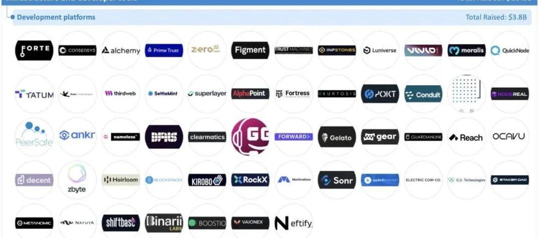 以Censensys、Alchemy、Thirdweb為代表的57個開發平臺項目共計融資38億美元,為程序員們提供幫助開發、測試、部署、維護鏈上產品的軟件、API以及工具。包括開發環境、節點管理、Web3原聲開發庫以及鏈上交互接口等。