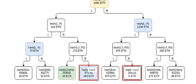 針對負值問題,Vitalik在文中提出了名為默克爾總和樹的改進方案。默克爾總和樹的每個節點都包含余額和哈希這2個信息。底層葉子節點是各個用戶的余額和用戶名哈希。在每個較高層節點中,余額是下面兩個節點余額的和,而哈希值是下面兩個節點整體信息的哈希,即對這兩個節點的余額和哈希值一起做哈希運算。將余額單獨顯示出來,有助于用戶識別負值,從而暴露CEX挪用用戶資產的行為。如上圖所示,Greta在做自行驗證時,會發現Henny的余額為負;Eve和Fred都會發現Greta和Henny余額的總和為負。這會導致他們3人驗證不通過。經過改造后,交易所使用默克爾樹發布儲備證明的過程如下。●生成默克爾樹證明:交易所委托外部審計公司或由其本身對所有用戶余額進行快照,然后將其匯總至默克爾總和樹。●驗證:審計師對比并核實交易所控制的余額是否大于等于默克爾樹所提供的數目。由此證明客戶的資產是否有全額準備金所支持。用戶可自行核對,若用戶的用戶名和余額數值在默克爾樹中,且計算過程中未出現負余額,則證明交易所沒有篡改用戶余額,也就是沒有挪用用戶資產。1.2默克爾樹的改進方案