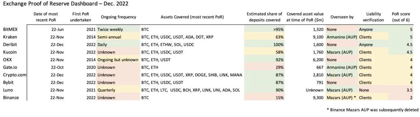 最近交易所都在亮出其PoR,但其公布的信息類別并非都是一樣的。在我的PoR跟蹤網站上,我將最近的交易所認證分為“金標準”、“優質”和“其他”。為了獲得“金標準”標簽,交易所應該做到以下幾點:滿足PoR的基本特性:對所持資產進行加密認證,并披露負債情況;最佳的做法是在流程中加入第三方審計員,以確保經證明的負債與內部數據庫相匹配;如果沒有審計員參與,則通過對平臺上所有資產進行PoR,并允許第三方驗證者檢查負債表的完整性,包括負債的非負性,來提高證明的可信度;堅持進行中的程序,并保持較高的審計頻率,這是針對不同類型的PoR。我希望看到由審計員監督的PoR的季度情況。對于無監督的,可能會有更頻繁的審計頻率。Kraken、BitMEX、Deribit和Kucoin符合上述標準,并在我的追蹤器上獲得“金標準”標簽。我給得分至少為4/6的交易所“優質”的標簽,給得分低于4的交易所“其他”的標簽。該測試為每個點加1分,部分點加0.5分:資產方面:該實體是否對持有的資產進行了加密驗證?PoR是否覆蓋了平臺上的絕大部分資產?該程序是否以合理的頻率重復進行?負債表方面:用戶能否驗證其是否包含在負債表中?如果交易所在保證金和貸款方面情況復雜,這些是否在負債證明中全部計入?是否有可靠的審計員對負債認證進行監督?下圖是我的研究結果。請注意,含主觀判斷。