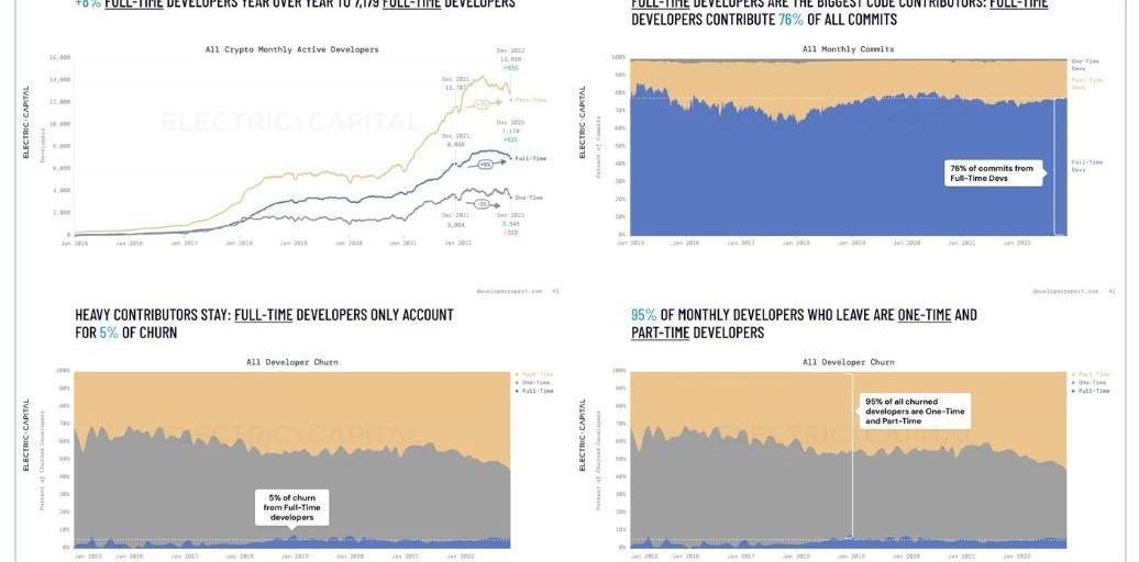 28%的開發人員同時從事BTC和ETH開發。50%的開發人員在網絡價值前200名的項目中工作。22%的開發人員在網絡價值200名之外的項目中工作。