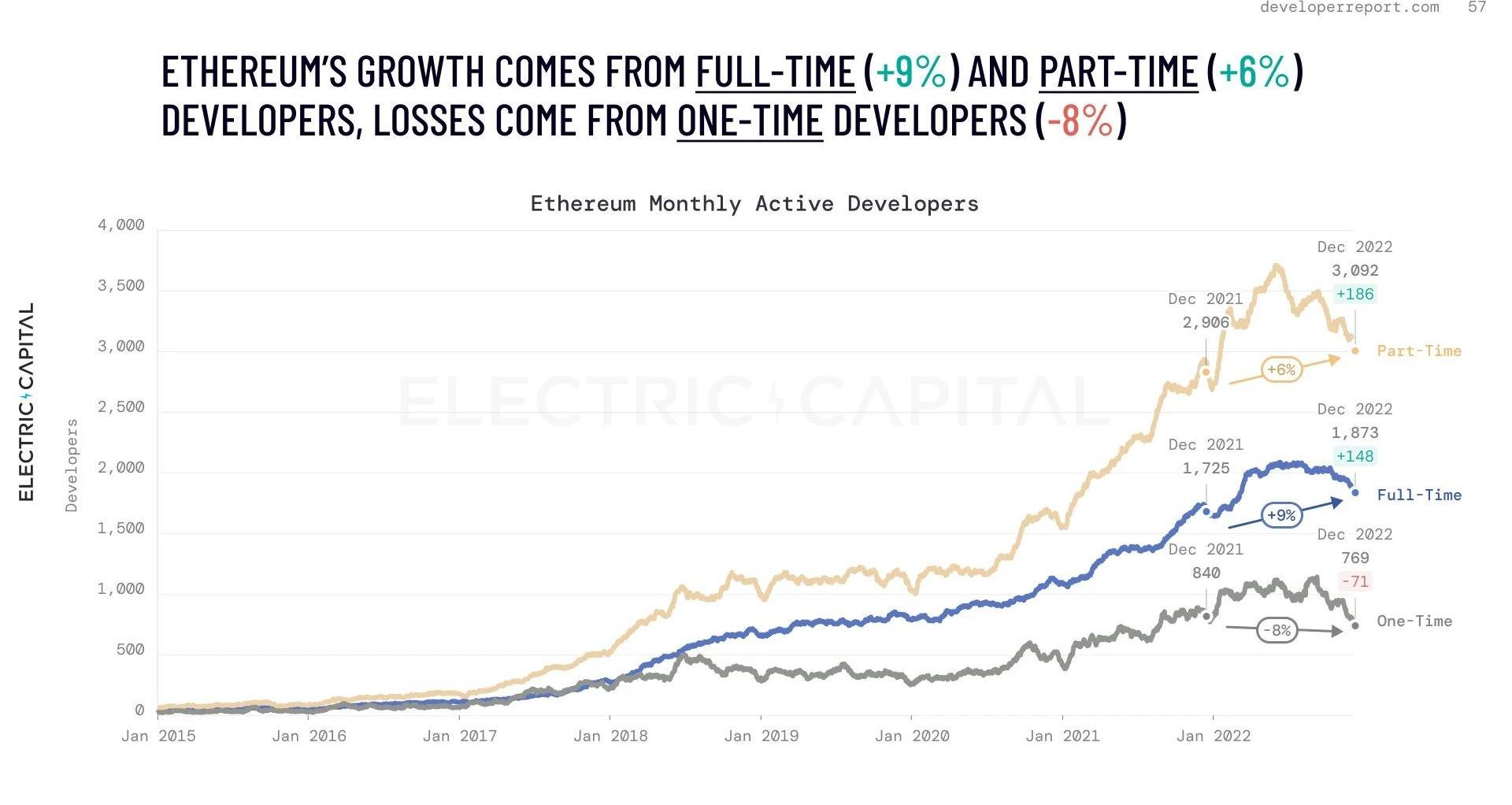以太坊是最大的加密生態系統,每月活躍開發人員增長了5倍,從1084人增加到5819人。全職開發人員增加9%,兼職開發人員增加6%,有16%新開發人員在以太坊上提交代碼。