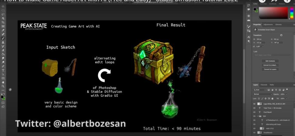 還有的游戲工作室在嘗試使用類似的人工智能工具來制作游戲中的美術作品。例如,下圖是來自AlbertBozesan,關于如何使用StableDiffusion來創建游戲中的2D資產的教程。