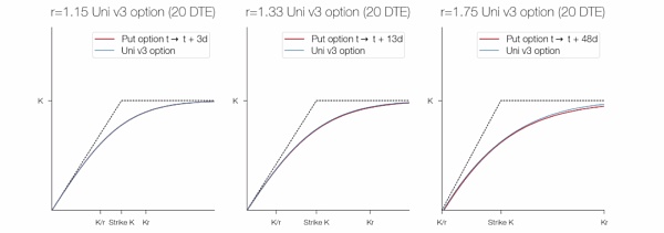 正如我關于在Uniswap v3中創建永久期權的文章所示,一個具有范圍因子r的Uni v3 LP頭寸的良好近似是在時間T_r的常規看跌期權,其中