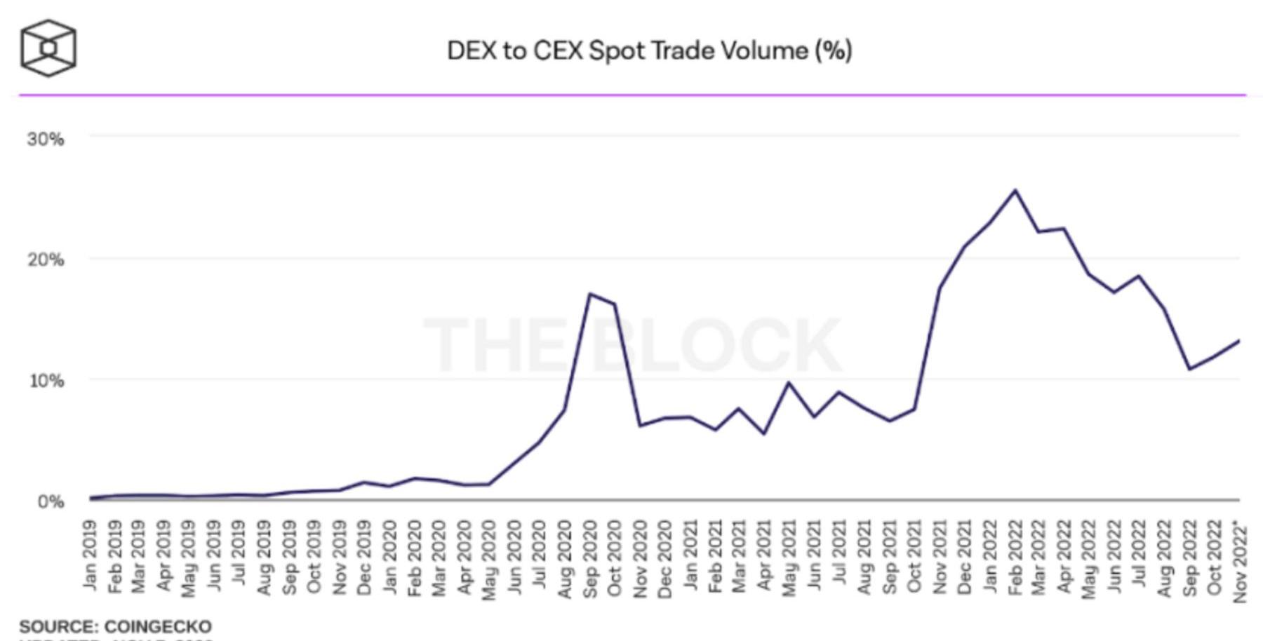 受到FTX和Babel等的影響,CeFi再一次成為眾矢之的。我們先舉一個例子,來闡述黑盒子操縱的資管類CeFi到底存在什么問題。CeFi吸引用戶本質上是依靠APY。如果市場上兩家大機構X和Y,X打出5%APY的收益吸引用戶,Y打出6%的APY。如果X和Y的branding都差不多,且背后backer也差不多,用戶大多都會去選擇Y存款,畢竟APY高。但是X就會因為市場競爭和收入等問題,為了獲客,只能加大到6.5%或者是7%吸引客戶。看似不高昂的APY在牛市期間其實無傷大雅,CeFi機構內強大的trading,quant和結構化產品會讓機構獲得遠高于5%-7%的收益。但問題在于一旦市場變化過大,且CeFi機構不例外存在著加杠桿的情況,遇到312,519,以及Luna事件,交易員還沒來得及調整倉位就容易被市場暴跌帶走。這就導致了近期市場FTX和Babel的巨星隕落。如果用戶知道高昂的APY來自哪里,那上述獲客問題能解決嗎?因此DeFi在近期又重回人們的視野。我們看到在近期,DEX/CEX現貨交易量之比穩定在了15%,相對于年初牛市時回落了40%左右,畢竟現在深熊,整體鏈上活躍度很差。但現在從鏈上交易量來看,61%來自Uni,27%來自Curve,9%來自Dodo。從衍生品交易價格的投喂來自Dex,衍生品交易的流動性來自于Dex等角度來看,現在DEX更像是整個DeFi的基礎設施。雖然Dex模型在不斷創新,但不可否認的事實是Uni的市占比在今年一直穩定在70%左右。這可能來源于用戶/鏈上做市商/tradingbot交易路徑的依賴以及uni的深度優勢。受益于CeFi今年的風評,正確的DeFi明年是否能有明新方向跑出?這還需要觀察。