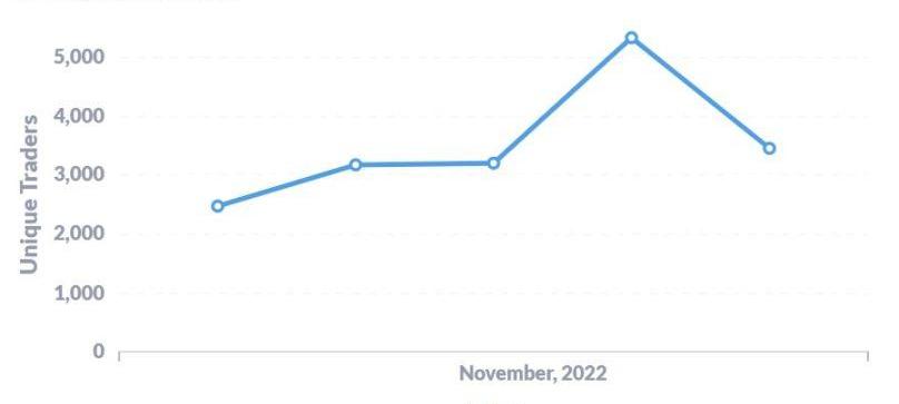 隨后兩天時間dYdX的日交易量逐步回落,但仍高達34.2億美元和23.1億美元,是今年8月份以來僅次于11月8日的日交易量數據。用戶角度看,11月6日至11月12日的一周時間里,dYdX活躍交易用戶達5338個,相比上一周的3201個增長66.76%。