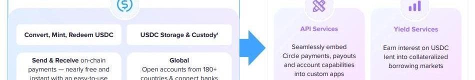 Circle賬戶Circle賬戶提供了一個以USDC進行支付和存儲資金的平臺,并將資金分配到收益產品中。Circle賬戶使企業能即時地在全球范圍內向任何與區塊鏈兼容的數字錢包進行支付和接收付款,為傳統的銀行支付提供一個高效且便宜的替代方案,目前已覆蓋90多個國家的銀行。CircleYieldCircleYield提供完全由比特幣抵押、建立在USDC之上的短期利率產品。所有抵押品都由BitGo保管。注:BitGo是一家擁有400多家機構客戶的第三方托管機構,合作伙伴是GenesisGlobalCapital,這是一家提供全方位服務的數字資產交易公司。自2022年2月作為自助服務產品正式推出以來,CircleYield已增長到約2.48億美元,年收益率最高可達6.3%。其利率來自于CircleYield從區塊鏈借貸市場借款人那里獲得的收益率,目前只向機構客戶開放。API服務Circle應用程序接口擴展了Circle賬戶的功能,使客戶能夠將Circle支付和基礎設施完全自動化、并整合到他們自己的支付等金融應用中。它提供四種API服務分別是賬戶API、支付API、PayoutAPI和DeFiAPI。