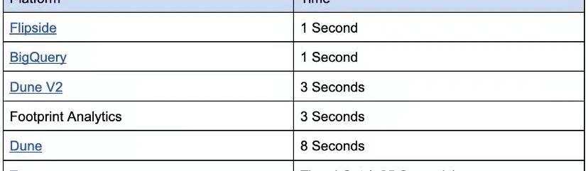 Transpose是最快的查詢,然而,輸出被限制。排在第二的BigQuery顯然是最快的,其次是Flipside,然后是DuneV2。Footprint沒有區塊表格,所以我無法測試查詢。DuneV1到V2進行了改進,但Flipside在性能上仍然超過了他們。支持的鏈數