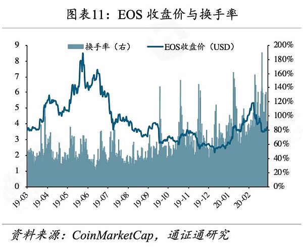 EOS現價3.83美元,周漲幅為9.1%,月跌幅為15.3%。日均成交量為35.9億美元,日均換手率106.8%。EOS波動較為劇烈,走勢偏弱。