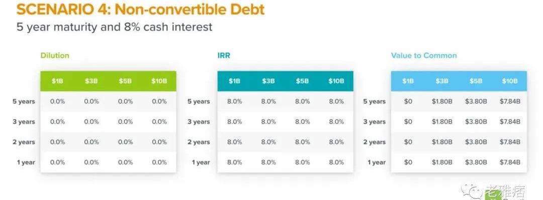 對于我們的第三個場景,該公司將獲得2億美元的可轉換債券,轉換價格為IPO價格的20%折扣,11%的PIK利息,以及1.25倍的優先流動性偏好。新投資者的所有權取決于IPO價格和時機。舉個例子,如果公司的估值在兩年內比上一輪翻一番,在IPO時達到100億美元,那么可轉債將轉換為公司股份的2.4%。另一方面,如果公司IPO價格為50億美元(與之前估值持平),可轉債將轉換為約4.8%的公司股份。如果該公司IPO價格為40億美元(比先前估值低20%),可轉債將轉換為公司股份的約6.0%。