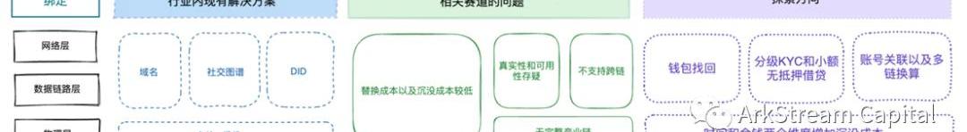 圖8綁定E.網絡層和數據鏈路層網絡層和數據鏈路層在互聯網里最重要的作用是確認傳輸地址和接收地址,Web2里的代表是IP地址,在Web3里最能體現出綁定和接收地址的是錢包公鑰私鑰體系。目前市場的解決方案集中于用戶入口的易用性提升,公鑰私鑰這些無規律的哈希函數極大地降低了錢包的易用性,就如同復雜的郵箱,銀行賬號都會提供昵稱功能一樣,以ENS為首的域名項目嘗試增加錢包的易用性降低使用難度。易用性的增加會讓錢包的綁定變得更加容易,也更容易識別。但用戶卻對遺忘,盜竊以及其他安全風險導致的錢包更換和丟棄等問題無能為力。私鑰的丟失和被盜會導致“身份”不再受到信任,所以如何找回錢包顯得尤為重要。SBT可以實現真正的錢包找回。如果可以通過SBT確認相關持有人的真實性,那么也可以通過某個賬號在社區里的貢獻,以及和社區成員建立的聯系來確定這個人是否真實存在。Vitalik在Desoc一文中寫道,用戶如果丟失私鑰,可以通過社群找回的方式重新拿回錢包所有權。最容易理解的例子就是微信賬號恢復,親朋好友可以通過給微信發特定信息幫助使用者找回賬號。SBT會賦予加密世界同樣的關系以及真實性,這個探索方向可以給現有的錢包安全性增加新的可能性。大量的錢包或者用戶入口相關的項目專注于怎么將錢包普及以及增加錢包的易用性。比如Metamask從一開始的token展示逐漸加入NFT顯示,內嵌自己的swap系統。Torus可以幫助使用者生成并管理自己的私鑰,同時也可以將賬號授權給他人共同管理。錢包安全和易用性是一把雙刃劍,錢包使用的門檻無法阻止用戶隨意丟棄“身份”,而絕大部分的使用者都是主動持有多個錢包并且隨意更換的。綁定的概念最根本在于是否可以將自然人與錢包所代表的鏈上身份進行綁定。換句話說,鏈上的行為背后是一個真實的人并且這個人并沒有通過大量生成錢包以此牟利。最常見的兩個項目類別是社交圖譜和DID。以LensProtocol和Cyberconnect為首的社交圖譜協議嘗試將鏈上所有行為整合,并且在同一系統內數據可以共享,從而達到鏈上身份的統一性。現在很多新的社交圖譜項目就在嘗試將SBT和社交圖譜相結合。FlamingleLabsFlamingleLabs是基于線下活動構建的Web3社交產品。用戶可以自然地進行Web3社交,從而構建分布式社交賬號圖譜。項目希望通過轉化線下活動來解決現在Web3社交有效用戶過少,充滿虛假賬號,及用戶DID過于扁平的問題。和社交圖譜并駕齊驅的賽道的是DID了。DID可以說是和SBT捆綁銷售最成功的賽道了。DID的項目要么專注于通過對于單一地址的分析從而發現賬號的屬性,要么將鏈下數據與鏈上相關聯。DefNetworkDefNetwork是一個為錢包地址創建用戶標簽的協同工具。在下載插件后,DefNetwork可以。將地址的鏈上數據進行整合和分析,并且生成標簽。開發人員和使用者可以在DefNetwork上索引特定標簽并且查詢地址。IdentDeFiWeb3身份信息插件,使用者通過連接錢包,鏈接銀行,并獲得KYC認證,從而mint一個不可交易的NFT,完成身份認證。項目采用Zk-proof的技術從而保證用戶隱私性。KNN3KNN3基于一套行為分析邏輯對鏈上的行為進行篩選分類,以地址為單位,通過行為分析來給地址加屬性,或者給2個地址定關系,從而了解賬號與賬號之間的關系并發展社交圖譜。無論是社交圖譜還是DID,如果可以和SBT的相關技術相結合,完全可以事半功倍。現有的鏈下身份和鏈上身份綁定的方法過于粗糙,大多數都會選擇安全性不高的方式,比如通過上傳證件,綁定銀行卡進行KYC。事實上,并不是所有的身份驗證都需要鏈下KYC才可以完成,結合了鏈上行為數據的SBT可以替代一部分KYC的使用。我們認為,KYC可以分級使用,一些低安全性的行為,比如空投,完全可以通過SBT的驗證來篩選出深度參與者。一些需要高安全性的行為,比如說借貸,需要進行身份驗證以及SBT數據的輔助驗證。借貸的本質是信任機制,借方如何通過信任機制確保貸方可以還錢。在傳統社會里借錢的行為是和社會關系高度綁定的,一個人的口碑,社會地位,經濟實力最能影響一個人可以借到錢。SBT的特點是將關系網帶入鏈上,這個關系網是有成本的,當放棄一個錢包的成本大于小額借貸的金額時,這個不需要了解對方真實身份的借貸場景就成立了。SBT可以通過構建鏈上信用積分,再決定不同檔位的小額借貸可以無抵押借貸的額度,越是時間長久,深度參與社群,關系網復雜的賬號,越是可以無抵押或者低抵押率的借到款項。這個方向的探索可以和NFT,DeFi等多個賽道夢幻聯動。F.物理層物理層較為特殊的一個層級,在Web3中,除了各種意義上的礦機,我們很難找到與“光纖和電纜”相對應的物件,但仔細觀察,會發現Web3InRealLife在我們不知道的角落悄悄蔓延。NFTPlay以NFT畫框為切入,打造DID專屬NFT移動展示設備,將NFT對應的DID身份與專屬可移動硬件結合,探索數字身份與現實世界的交互場景。從Artblock等一系列NFT產品爆紅后產生的NFT展示顯示器到SolanaMobileStack的安卓智能手機--Saga,都在向我們傳遞一個新的信息:Web3的光纖已經萌芽,符合各種應用場景的產品已經開始出現。就如同2013年的漢諾威工業博覽會上提出的一樣,工業1.0是蒸汽機時代,工業2.0是電氣化時代,工業3.0是信息化時代,工業4.0是智能化時代。一個將智慧賦予機械,將看不見摸不著的算法,算力,信息流加載實體的新的工業革命