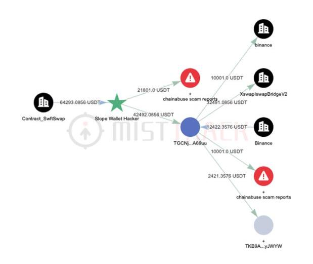 慢霧安全團隊通過各方的能力以及全球情報資源,包括對DNS解析數據查詢和分析,目前暫無明確證據能夠證明域名o7e.slope.finance曾經發生過DNS劫持事件。鏈下調查和分析的階段性結論:就現階段的調查和分析的情況看,未發現外圍服務器可以直接被入侵的風險點;未發現服務器被入侵的痕跡但是對可疑IP仍需要繼續調查;DNS劫持的可能性較小;已在數據庫表、數據庫日志文件、磁盤已刪除文件恢復后的數據中發現了私鑰和助記詞信息。鏈上分析部分