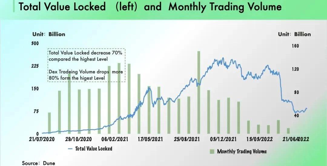 XRP/HKD-1.03%數字資產市場在今年5月陷入流動性危機,通證價格暴跌導致鏈上持倉清算,流動性危機對DeFi生態造成了非常嚴重的影響,參考DeFiLIama數據,整體鎖倉價值急劇下跌,相較于高點回撤幅度超過70%,在這其中,許多知名DeFi協議在本次危機中出現了兌付困難、管理混亂、信用缺失等等問題。本文意在對本輪流動性危機進行復盤,由此探索危機發生的根本原因,以及熊市環境對DeFi生態發展會帶來哪些影響。一、流動性危機始末