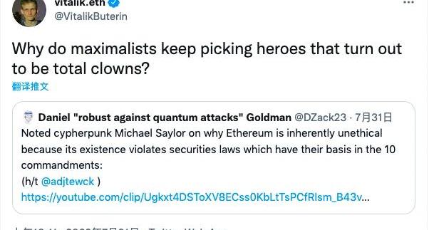 剛剛過去的這個周末,比特幣持倉最多的上市公司MicroStrategy創始人MichaelSaylor的一番言論再次激化了比特幣原教旨主義者與以太坊社區的矛盾,雙方在社交媒體上打響了口水戰。周日,MichaelSaylor做客一檔播客節目時表示,美國證券法的基礎是「十誡」,這是一套與道德和敬拜有關的圣經原則。“證券法的基礎是你不得說謊、欺騙或偷竊。這是法律的基礎。以太坊是不道德的。”MichaelSaylor還表示,“所有合法人才都在比特幣生態系統中工作。如果你誠實、有道德、有能力,你就會在閃電網絡上進行建設。”此外,他還認為除了比特幣之外的其他山寨幣都是證券。這并不是MichaelSaylor第一次將矛頭對準以太坊。7月初,他就曾表示,ETH是一種證券,因為它是通過ICO發行的,有一個管理團隊,有一個預挖,有一個硬分叉,有持續的硬分叉,有一個不斷被推后的難度炸彈,并且其網絡多年來發生了許多根本性的變化。“BTC屬于商品。因為比特幣網絡的核心無法改變,就像黃金的物理構成一樣。”上周在參加BlockchainEconomy時,MichaelSaylor再次評論以太坊,稱其并不會在36個月份完成ETH2.0升級,技術上存在漏洞,并用「道德論」攻擊以太坊。“‘合乎道德’意味著我需要知道沒有人可以改變「協議」,包括Vitalik。我需要知道以太坊基金會旗下的任何組織、任何個人都不能改變協議;如果他們可以改變協議,它使它成為一種證券;如果它使它成為一種證券,那么它就不會成為全球貨幣。”MichaelSaylor一連串的攻擊言論,引發了以太坊社區對其不滿。以太坊創始人V神親自下場發布推文稱MichaelSaylor是「跳梁小丑」,“為什么極多主義者總是選擇那些最終被證明完全是小丑一樣的人作為英雄?”