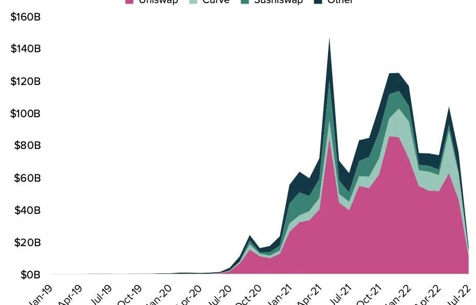 ETH/USD穩定幣和ETH/BTC的市場深度比較在市場波動的情況下,DEX月交易量也保持穩定。2021年6月,DeFi幾乎失去其地位,而DEX處理了數十億美元的交易量。截至2022年6月,以太坊上的DEX與Uniswap一樣,交易量約為750億美元。2022年7月的DEX交易量也與2022年2月持平,當時以太坊的價格大約高出2.5倍,分別約為2800美元和1100美元。