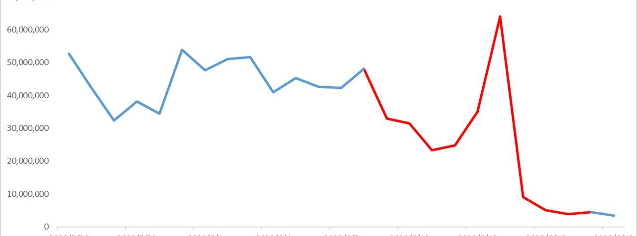 BTC市值,數據來源:CMC同樣,NFT市場因此受到了影響,近來OpenSea的交易量也在呈現下降趨勢,但我們看到6月7日到6月18日這段時間內的交易量出現異動。在下降趨勢中,NFT市場仍產生了短暫的大量交易,期間發生大量換手,因此我們本次選定該時間范圍作為分析區間。