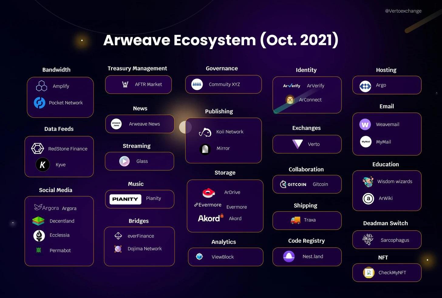 Arweave網絡的核心是一個數據庫,更像是一條Layer0,是網絡世界的基礎組建;Permaweb作為應用層,負責實現NFT存儲和交易、流量變現、交互變現等場景,為Arweave帶來了更高的市場契合度。根據VertoExchange數據,2021年10月份,使用Arweave存儲構建的DApp僅35個,僅3個月后,漲到了約65個。生態項目覆蓋了NFT、DeFi、錢包、存儲等賽道,但大多仍以基建為主。每個賽道都有至少一個的代表項目,如ArDrive,ArConnect、Pianity,EverPay等。盡管仍處于”重技術、輕dapp”的狀態,Arweave的技術事實上也為生態增長提供了可能性。例如,首個跨鏈DEXPermaswap在2022年5月16日發布了官網和白皮書,來填補Arweave生態的跨鏈DeFi的賽道空白。