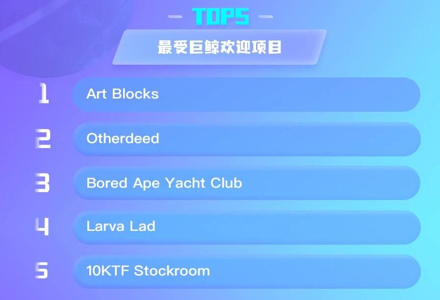 最受巨鯨歡迎項目排前五的分別是:ArtBlocks、Otherdeed、BoredApeYachtClub、LarvaLad和10KTFStockroom。