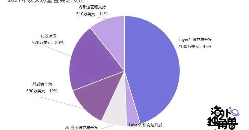 EthereumFoundation持有約為16億美元,分為13億美元的加密貨幣,和3億美元的非加密貨幣投資和資產。持有的絕大部分加密貨幣是以ETH形式持有的,占ETH總供應量的0.297%。Gasfee中支付的ETH并沒有讓任何中心化的實體獲利,沒有任何公司從你支付的費用中收取分成,gasfee支付給礦工,因為他們貢獻了必要的資源來維持以太坊的運行。因此,你可以把gasFee看成是網絡運行所需的基本“物資”。收入:當你使用任何一個Layer1的時候,你為他們提供的服務支付原生代幣,你支付的費用,收入會以staking獎勵的形式為資產持有人所有,這就是以太坊收入。支出:加密對沖基金NorthRockDigital的創始人HalPress提出了一個新穎的視角——對于PoW來說,發行量是一種費用,因為發行量不歸代幣持有人所有,而是歸礦工所有,所以現在以太坊每年發行400萬個幣,這是一個巨大的費用。但Merge后,ETH的發行不再被視為一項支出,因為在PoW的機制下,礦工為了補償自己礦機等硬件成本,傾向于賣出ETH,但在PoS機制下,質押者通常選擇長期質押和持有,質押獎勵還是在以太坊生態中,沒有離開系統,因而這部分的發行不能算作成本。除此之外,PoW的大部分費用是電費。這屬于網絡的實際支出,因為對于運營網絡的人來說,這是需要花錢的事情,而盡管PoS仍然需要運行節點、支付電費,但費用與之前相比是低很多的。2021年,以太坊基金會總支出大約4800萬美元。其中約有2000萬美元是以外部支出的形式,包括贈款、委托領域分配、第三方資金、賞金和贊助。