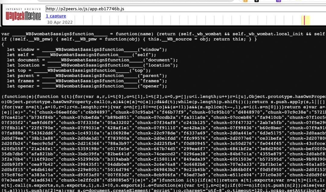 根據網頁快照可以發現https://p2peers.io/的前端代碼,其中主要的JS代碼是“js/app.eb17746b.js”。由于已經無法直接查看JS代碼,利用Cachedview網站的快照歷史記錄查到在2022年4月30日主要的JS源代碼。