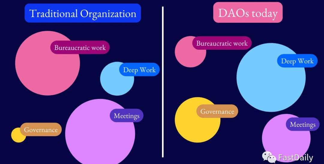 作家和研究人員發現,我們糟糕的工作習慣可以歸咎于許多方面:持續的聯系、對太多閑暇的恐懼、員工無法說“不”、以及中位數收入增長慢于預期,需要更多的工作。但我發現最令人信服的論點是,我們只是憑空創造了更多的就業機會。專業管理階層,也就是以管理他人為生的人,占美國工作崗位的35%。在美國,超過三分之一的勞動力不一定是生產性勞動力,而是管理其他人的勞動力。隨著我們技術的進步,這一比例也在不斷增加。20世紀30年代,只有1%的美國勞動者被認為屬于專業管理階層。1972年,這一比例上升至24%,1983年為28%,2006年為35%,這是我們掌握的最新數據(我敢說現在甚至更高)。我不是想抨擊經理們。我只是對我所經歷的技術革命感到困惑,這場革命幾乎沒有為朝九晚五之外的新工作方式開辟機會。在很多方面,專業管理階層的工作已經變成了電子郵件工作。電子郵件工作缺乏靈活性。它們并不能讓我,或者世界上任何一個人對工作感到興奮。從事電子郵件工作的人存在著以下情況:被會議困擾,參加一場又一場的會議,以便在另一個會議中向不同的人群傳播信息。處理電子郵件。回復電子郵件成為了工作的重要組成部分。如今,這可能還包括Slack或Discord。困在官僚主義的舞臺上:從員工評估到不斷加長的電子表格。DAO如何才能擺脫電子郵件工作,并為許多貢獻者打開大門,讓他們真正減少工作。這與更好的健康、更少的倦怠、更多的幸福感、更高的生產力、更好的決策息息相關。我想對這篇文章進行細化。首先,我們將看看在傳統組織和DAO中,工作日中的時間是如何度過的。我在傳統組織和DAO中都工作過。我回顧了自己在這些組織中的工作日,并把基本工作日的時間花費分為四類:官僚工作:沒完沒了的電子郵件、文書工作、文件災難、廣泛的路線圖計劃……把這看作是“不必要的”工作,每當你想做它的時候就會引起巨大的嘆息。深度工作:做你受雇做的“事情”。關鍵詞:輸出。治理:做出決定,設計組織,并建立角色。會議:通話時間(即使我同時處理多項任務……)。這是我根據自己的經驗制作的圖表。圓圈的大小與我估計在該工作領域花費的時間相等。圓圈越大,我在那個區域花的時間就越多。我的經驗僅限于少數幾個組織,以下是我根據自己的反思總結出來的: