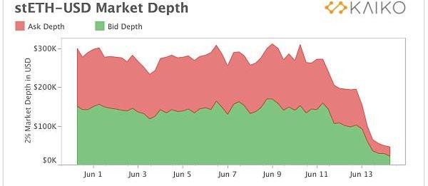 使用2%的市場深度作為中心化交易所可用stETH流動性的衡量標準,我們在6月11日之前觀察到FTX上只有價值30萬美元的stETH流動性。但在Celisus的恐懼席卷市場之后,這個數字下降到不到5萬美元,而stETH持有者現在幾乎耗盡了他們在中心化交易所可以找到的所有可用的stETH流動性。為了說明在FTX上僅出售價值10萬美元的stETH會招致的損失,我繪制了交易所中stETH-USD對的滑點圖,我們可以看到在FTX上僅僅出售價值10萬美元的stETH都已經變成完全不可行。該貨幣對的滑點已增至3.5%,再加上stETH對ETH價格的折扣約為5%,這意味著在中心化交易所出售stETH導致10萬美元的訂單損失8.5%。