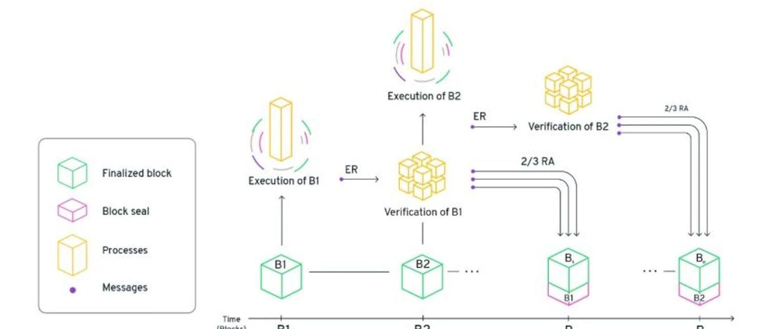 如前所述,Flow區塊鏈網絡運行多節點架構設計。為了避免以太坊分片的復雜性,Flow的多節點架構可將交易不同階段驗證節點的任務分離,從而使得每一類節點都專注一項任務,以提高每個驗證步驟和每筆交易的效率。與之相比,在分片的設計中,分片的節點分別負責不同的交易,但不在單筆交易的每個步驟設置專門的驗證節點。這一設計鼓勵節點專注確定性任務或非確定性任務,其理念在于導致網絡擁堵的主要環節是確定性任務,也即“客觀”任務,例如計算有先后順序交易的結果。每個節點都在既有能力上不斷優化,從而提高整體區塊鏈的吞吐量,進而解決網絡內用戶和開發者的問題。Flow區塊鏈上的任務由四類不同的節點分別執行,每個節點都需要先質押一定數量的資金才能執行指定任務:共識節點:確定每筆交易是否存在及其先后順序。執行節點:執行與每筆交易相關的計算。驗證節點:確保執行節點正常運行,維護網絡安全。收集節點:從用戶代理收集交易數據,為Flow上的項目提供更好的網絡連接性和數據可用性。為了保證網絡的安全性,Flow鏈上有大量的節點為執行非確定性任務的共識和驗證節點,從而提供網絡安全性保證。執行和收集節點則執行純粹確定性的任務,因此不易受到攻擊。這也意味著執行節點必須由特定的專業硬件設備運行。