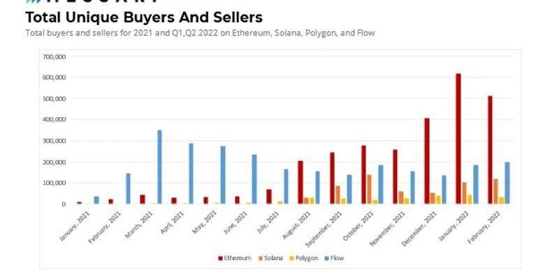 就總交易量和活躍錢包而言,Flow目前擁有超過300萬活躍用戶,包括委托人和驗證節點。由于協議上線時間尚短,Flow要趕上諸如以太坊這樣的“古早”L1生態,還有很長的路要走。然而,Flow在加速用戶活躍度方面取得了重大進展,它為希望在網絡上構建和部署的新開發者提供充分的支持,以吸引各個賽道的dApp,例如DeFi和Web3項目。隨著越來越多的項目基于Flow搭建,它和其它鏈在網絡流量以及生態參與程度方面的差距也在不斷縮小。如前所述,目前Flow上已經部署了800多個智能合約,并且它尤其以吸引NFT項目而聞名。Flow鏈上的NFT二級市場交易量與其他L1鏈相比形成鮮明對比。Flow在NFT的C2C交易方面似乎一騎絕塵。此外,隨著原生項目的用戶持續參與,和新項目的大量涌現,Flow繼續在NFT領域取得長足進步。