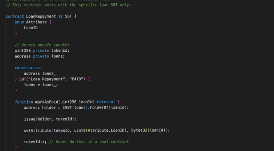 為了抹去還清貸款后的歷史記錄,此處創建了另一個將被發放給靈魂的代幣——$PAID。貸款者可以選擇保留或銷毀原有的貸款代幣,或者對調一個名為「isPaid」的布林值。在這個例子中,持有人賬戶中的$LOAN被撤銷,但合同中保留了該代幣的歷史屬性。