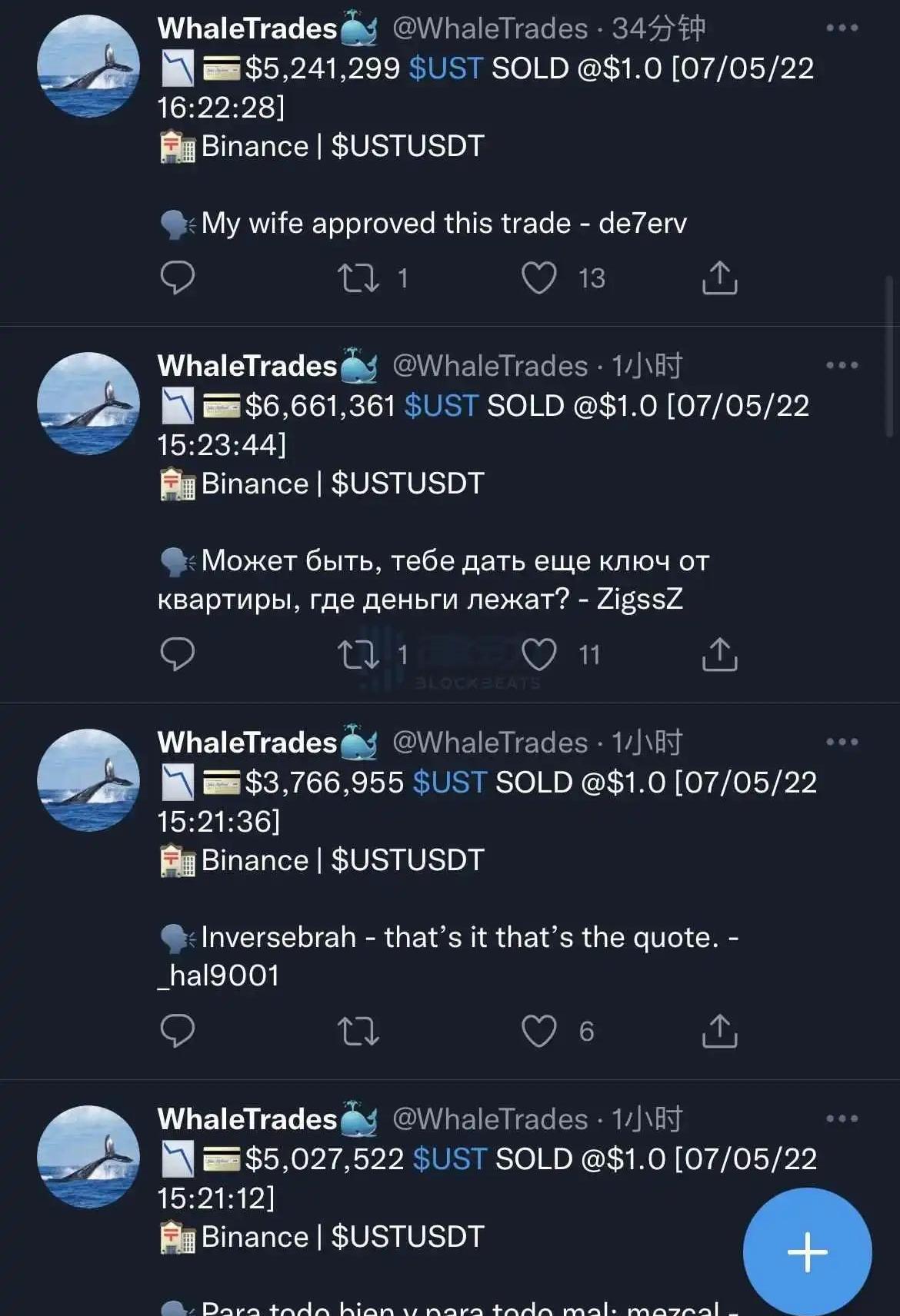 究竟發生了什么?讓我們從上周日凌晨開始梳理整個過程。5月8日晚,推特上的巨鯨預警賬號開始瘋狂「報警」,每隔一小時就有一條拋售UST的消息,且交易金額均在百萬級別。
