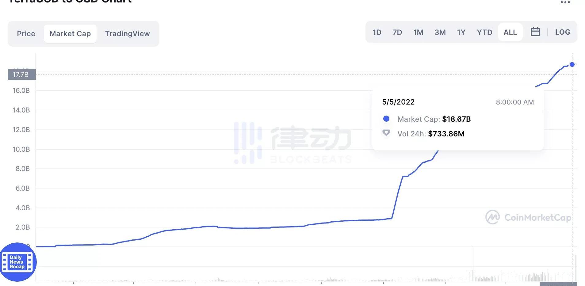 據CoinMarketcap數據,UST市值在今早短短數小時內蒸發近40億美元,目前跌至約140億美元。