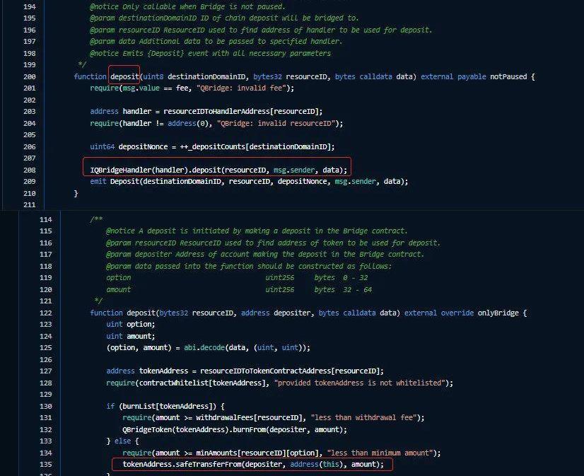 上圖中,存款是一種正常的存款方式。當在此方法中調用IQBridgeHandler(handler).deposit時,當用戶傳入的resourceID映射tokenAddress地址為0地址時,后續的tokenAddress.safeTransferFrom(depositer,address(this),amount);轉賬將正常執行,導致方法和事件的正常運行,調用者可以成功進行存款。這里更重要的是,官方tokenAddress的ETH0地址是官方所做的(官方已經聲明存款功能是一個被忽略的廢棄功能)。MeterBridge攻擊分析