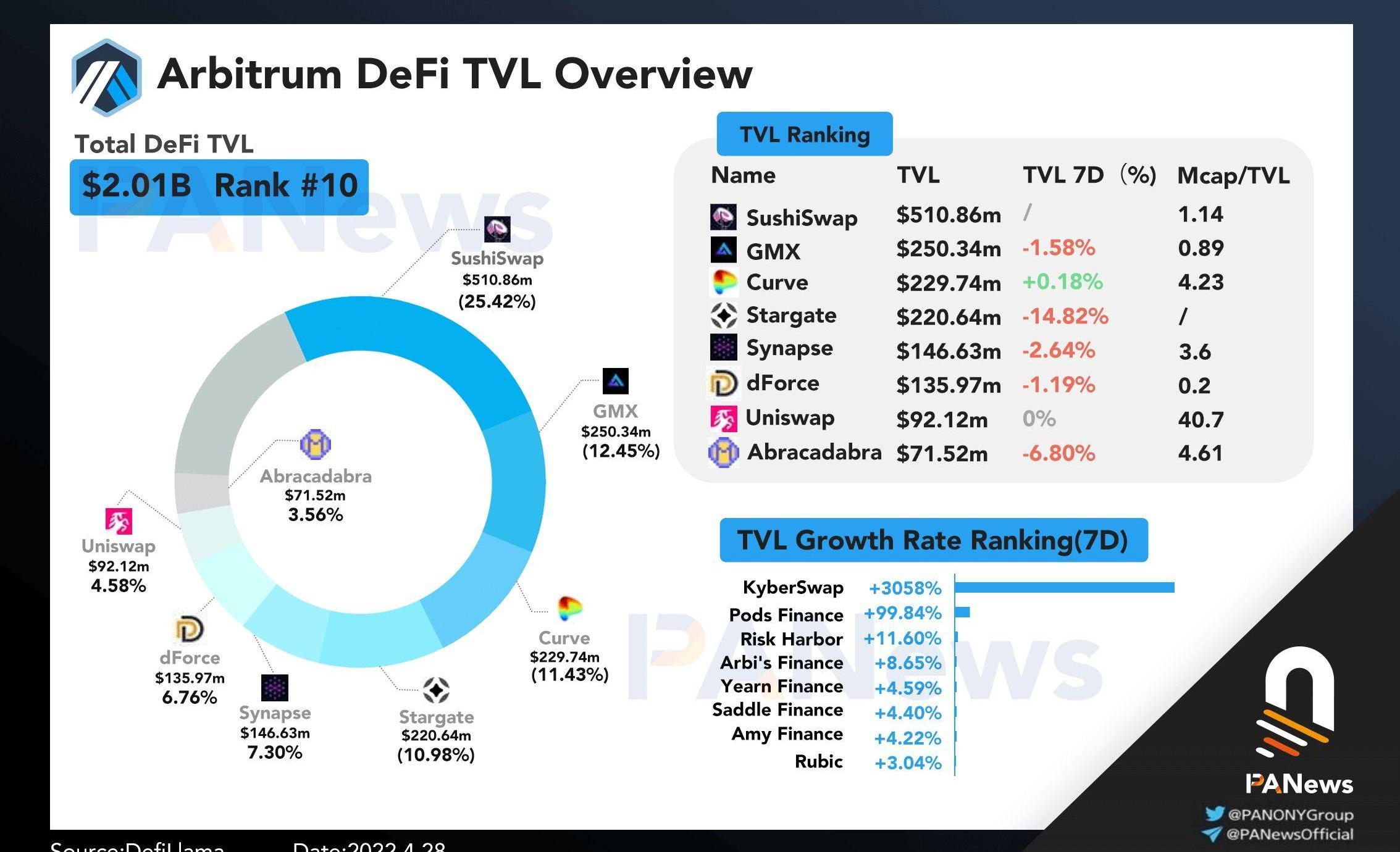 Arbitrum生態DeFi鎖倉量一覽據PANews了解,目前Arbitrum大約占據整個Layer2總TVL的56.3%,最近也是“動作頻頻”,近一個半月整個生態大約新增了13個Dapp和協議,涉及的領域主要有DeFi、NFT、跨鏈、隱私和錢包等,本文將逐一介紹近期Arbitrum生態新晉成員的基本情況。DeFi