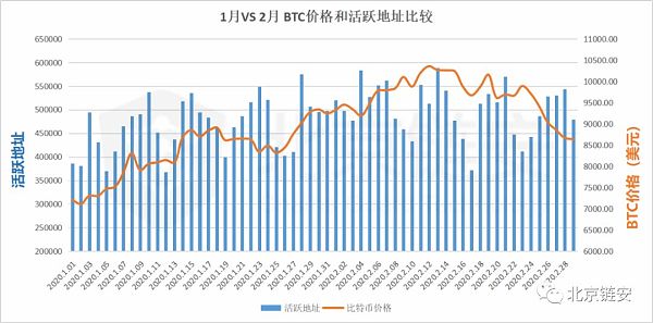 從近兩個月活躍地址數和比特幣價格的比較來看,可以看到2月份幾次價格向下調整,包括最后的大跌前,活躍地址數都有個向下的變化。