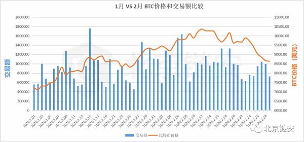 從近兩個月比特幣價格與交易額的對比來看,2020年2月上半月價格上升期間,鏈上交易額整體還是處于相對高位,但是在價格震蕩階段鏈上交易明顯降低,接著便出現了價格的大幅下跌。