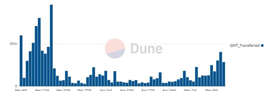 再來觀察StepN日活躍數走向,作為能夠判斷項目是否具有“勃勃”的生機,日活用戶指數也是鏈游項目必不可少的重要指標。據統計,自4月中旬起,StepN上的活躍用戶數量始終維持在10K以上且較為固定,新老用戶的人數都是表現出上升趨勢,不斷涌入新的用戶能夠滿足StepN長遠發展的基本要求。3.4GST與GMT每日出入金流動率