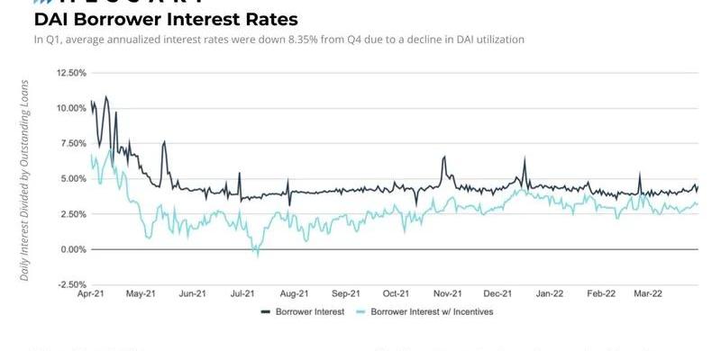 借款平均年化利率從第四季度的4.5%下降到第一季度的4.12%。借款利率在本季度觸及3.58%的低點并曾達到5.10%的峰值。第一季度使用率上升3.24%,導致借款利率波動。DAI未償貸款量占本季度末所有未償貸款的42%以上。