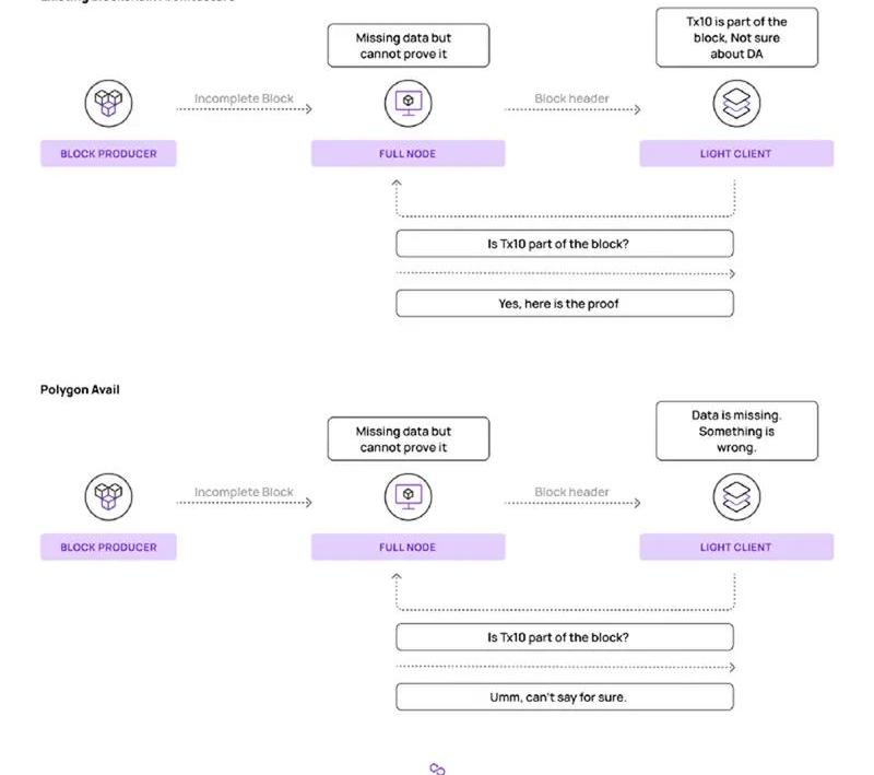 PolygonAvail是Polygon的兩大架構產品中的第一個。Avail旨在解決節點在處理惡意或不完整數據時面臨的挑戰。在區塊鏈世界中,這些挑戰被稱為數據可用性問題,也就是上面提到的導致研究人員放棄Plasmarollup計劃的問題。發生此問題的常見情況包括節點接受數據不完整的區塊或節點無法驗證網絡中交易數據的準確性時。Polygon將Avail描述為跨多鏈以太坊生態系統的數據可用性問題的解決方案。Avail是專為獨立鏈、側鏈和其他擴展技術設計的數據可用性特定區塊鏈——這意味著整個Avail鏈旨在存儲以太坊“調用數據”跟蹤對以太坊狀態機的更改。Avail上不會部署智能合約,也不會構建應用程序。相反,Avail存在的全部目的是對數據進行排序和存儲,以確保數據仍然可以被輕客戶端節點執行的采樣過程訪問。