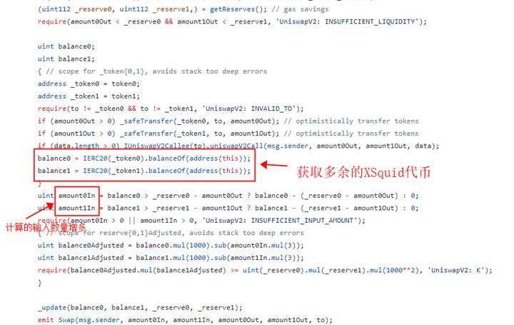 -DecentralizedExchange通縮代幣未設置pair為分紅例外通縮代幣在交易時會產生額外的分紅與手續費。如果交易合約中包含了此類代幣,且沒有進行特殊處理,那么,就可能導致交易對合約記錄的代幣儲量與實際的代幣可用余額不一致。以XSquid事件為例,XSquid是一種通縮代幣,未將其與WHT代幣組成的pair合約地址添加獎勵例外列表,造成了pair合約除了正常代幣兌換和流動性存儲外,還存有多余的XSquid分紅獎勵代幣。因此,攻擊者就可以調用Swap函數將pair合約多余的XSquid代幣轉換為WHT提取,或者通過skim函數將多余的XSquid代幣直接提取。